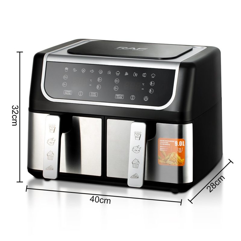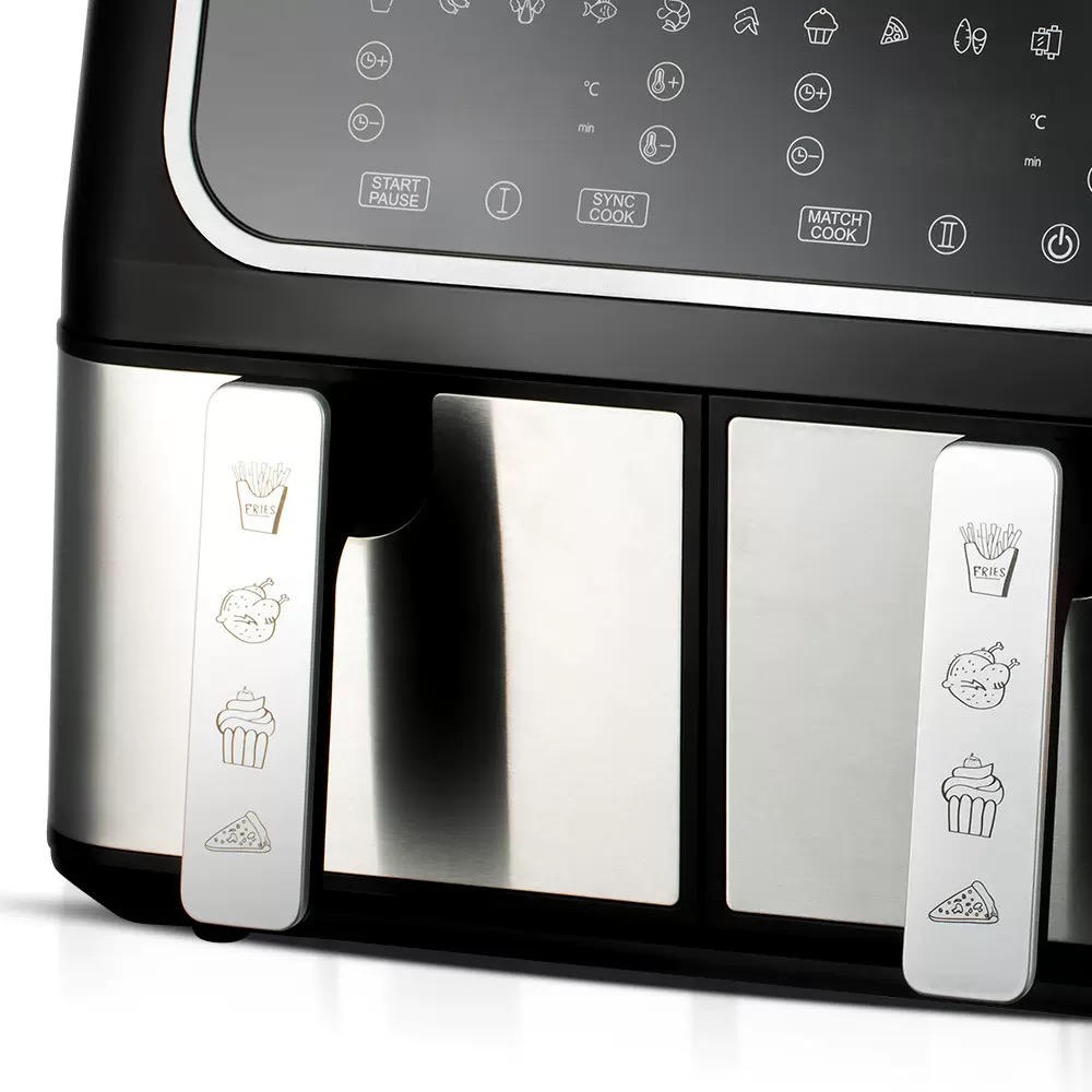 - DUAL AIR FRYER WITH 2 BASKETS: Cook food faster and more conveniently with two powerful air fryers in one with a combined 9 L large air fryer capacity.