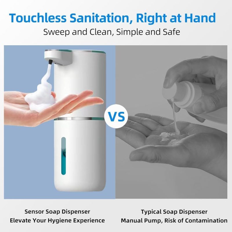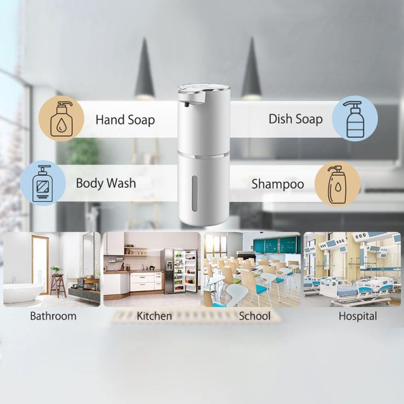 - Widely Use Foaming Soap Dispenser: The touchless soap dispenser is compatible with a wide range of liquids such as hand sanitizers, detergents and shampoos, which makes it perfect for use in kitchens, bathrooms and other public facilities such as hotels, offices, schools, hospitals, shopping centers, guesthouses and more.